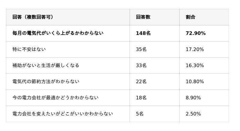 補助終了後の電気代について不安に感じることを聞いたところ、「毎月の電気代がいくら上がるかわからない」が72.9%で圧倒的な1位でした。