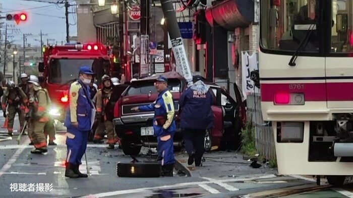 視聴者が撮影した写真では、乗用車は接触後電柱に衝突したとみられ、電柱が傾いているのが確認できます。