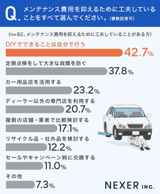 オイル交換やワイパー交換などを自力で行い工賃を節約する方が多いようです。また、定期点検で小さな不具合を早期に発見し大きな修理を防ぐ予防の工夫も目立ちました。