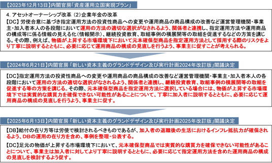 - また、DBについては、将来の給付水準が相対的に低下しないよう、加入者の退職後の生活におけるインフレ抵抗力が確保されるような給付改善等の検討が求められます