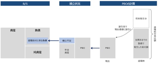 - 貸借対照表では、退職給付債務(以下、PBO)から年金資産を控除した金額を計上します