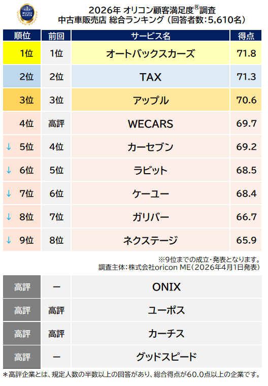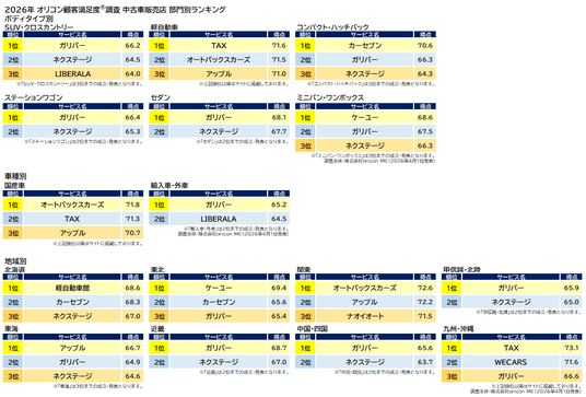オリコン株式会社(本社:東京都港区 代表取締役社長:小池 恒、略称:オリコン)は、グループ会社である株式会社oricon MEが、実際のサービス利用者を対象に第三者の立場で実施した『中古車販売店』の顧客満足度調査の結果を、2026年4月1日(水)14時に「オリコン顧客満足度(R)」公式サイト内にて発表いたしました。ランキングの結果は下記の通りとなりました。