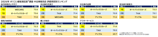 『中古車販売店』評価項目別ランキング(2026年 オリコン顧客満足度(R)調査)