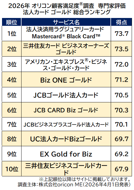 『法人カード ゴールド(専門家評価)』総合ランキング(2026年 オリコン顧客満足度(R)調査)