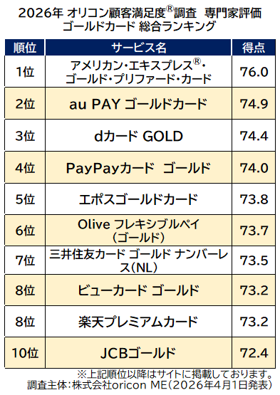 『ゴールドカード(専門家評価)』総合ランキング(2026年 オリコン顧客満足度(R)調査)