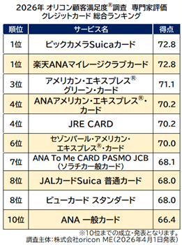 『クレジットカード(専門家評価)』総合ランキング(2026年 オリコン顧客満足度(R)調査)