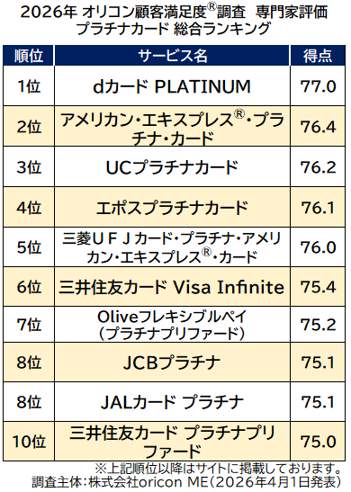 『プラチナカード(専門家評価)』総合ランキング(2026年 オリコン顧客満足度(R)調査)