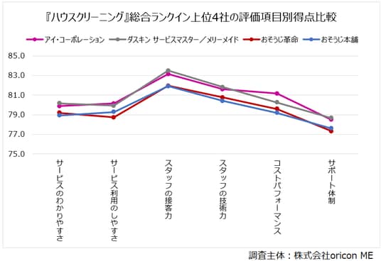 『ハウスクリーニング』総合ランクイン上位4社の評価項目別得点比較表(オリコン顧客満足度(R)調査)