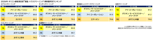 オリコン株式会社(本社:東京都港区 代表取締役社長:小池 恒、略称:オリコン)は、グループ会社である株式会社oricon MEが、実際のサービス利用者を対象に第三者の立場で実施した『ハウスクリーニング』の顧客満足度調査の結果を、2026年4月1日(水)14時に「オリコン顧客満足度(R)」公式サイト内にて発表いたしました。ランキングの結果は、下記の通りとなりました。