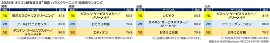『ハウスクリーニング』地域別ランキング(オリコン顧客満足度(R)調査)