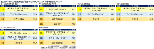 『ハウスクリーニング』総合ランキング(2026年 オリコン顧客満足度(R)調査)
