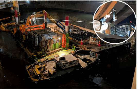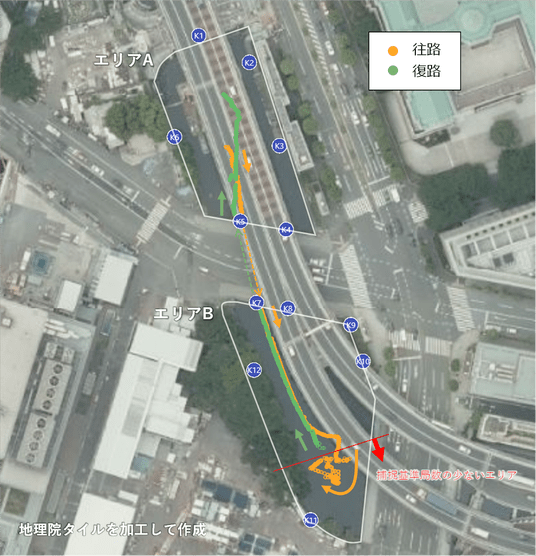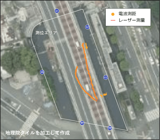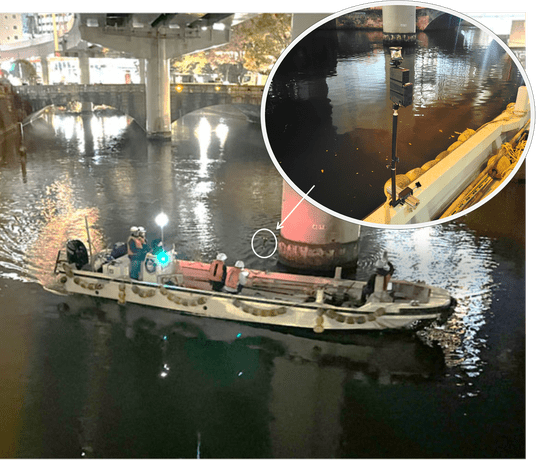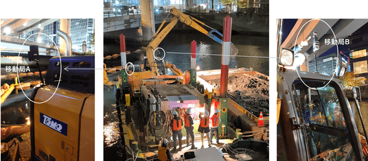 首都高速道路高架橋下の施工エリアに基地局を12カ所設置し、日本橋川を行き来する通船(移動局)の追尾試験を実施しました。