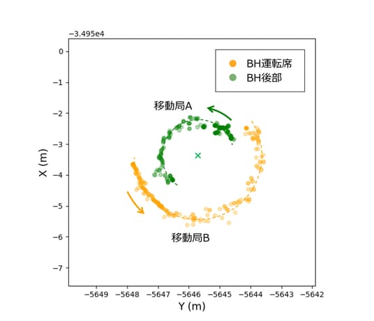また、浚渫作業を行う台船上のバックホウについて、運転席と車体後部にそれぞれ移動局を設置し、ブームの旋回状況を追尾する試験を行いました。