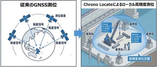 本技術は、GNSSを地上に展開した「ローカルGPS」ともいえる仕組みで、衛星の代わりに複数の基準局を測位対象エリアに設置し、移動局に届く電波の到達時間差を極めて精密に計測することで、高精度に位置情報(座標)を算出します。