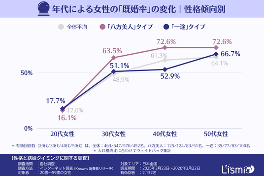 チャット占いアプリを提供する株式会社リスミィ( https://lismi.jp/ )(本社:大阪府大阪市、代表:西村士世)は、女性の価値観や性格が結婚のタイミングにどのような影響を与えるかを明らかにするため、全国の20~59歳の女性2,132名を対象にアンケートを行いました。本調査では、性格傾向によって結婚へと向かうタイミングに違いがあり、自分の軸を持つ「一途」な人ほど、特定の年代で足踏みしやすい傾向が見えてきました。
