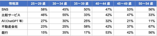 銀行を情報源とする割合は25~29歳で15%、50~54歳で56%と世代差が大きく、若い世代は銀行よりオンラインで情報を集めています。AI(ChatGPT等)は40~44歳の32%が最高で、住宅購入の中心世代にもAI利用が広がっています。