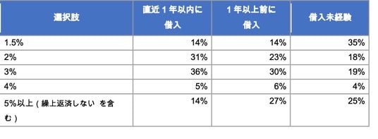 一方、銀行は34%(1年以上前に借りた人では44%)、家族・知人は16%(同26%)と減少しました。特に家族・知人は前回の35%から16%と急減しました。金利のある時代になり、周囲に相談できる経験者が減っていると考えられます。