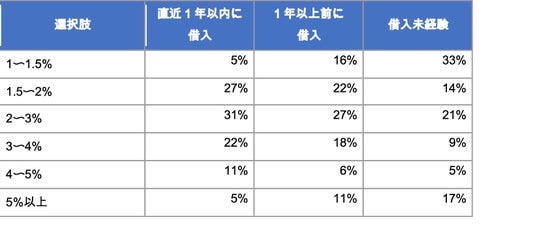 一方、住宅ローンを借りたことがない人では「1~1.5%」が33%と最多である一方、「5%以上」も17%あり、金利の相場観にばらつきが大きい状態です。