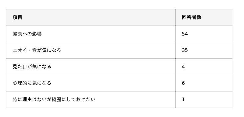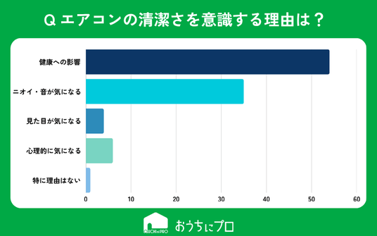 - エアコンの清潔さを意識する理由は「健康面への影響の考慮」が最も多く、次いで「ニオイ・音が気になる」ことが理由に挙げられる。