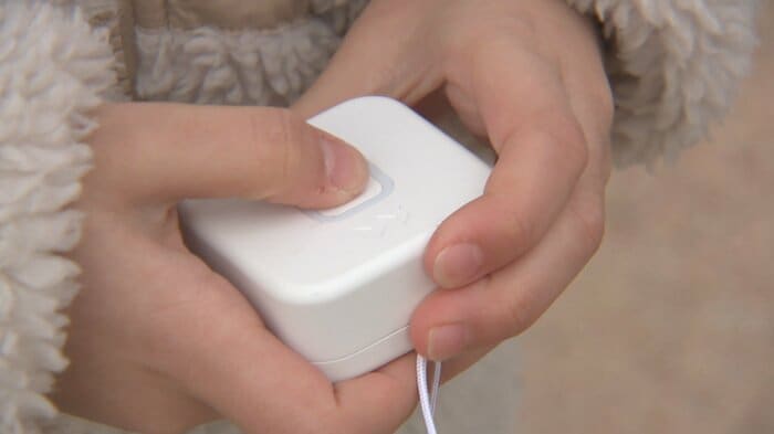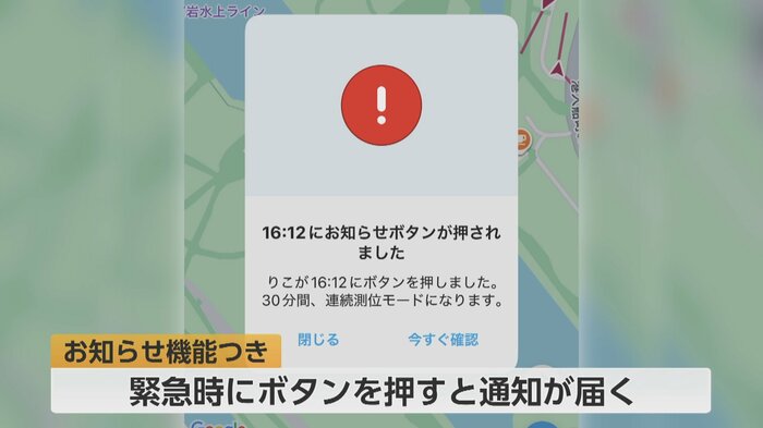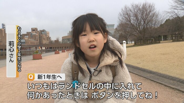 緊急時の機能もある。端末のボタンを押すと、保護者のスマートフォンに通知が届く仕組みだ。莉心さん自身もその使い方を把握しており、新1年生へのアドバイスを聞くと、「いつもはランドセルの中に入れて、何かあったときはボタンを押してね」と話してくれた。