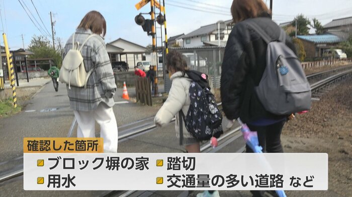 この日は新1年生を中心に親子30人が参加した。公民館から小学校までは、子どもの足で片道45分。ブロック塀が多い細い路地、踏切、交通量の多い道路など、通学路上の危険な場所を親子で一緒に確認した。同時に、110番の家の場所を覚えたり、登下校中の災害やトラブルに備えた行動を学んだりと、実践的な内容となった。