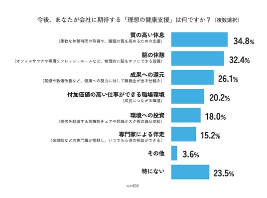 また、社員が求める理想の施策について質問したところ、最も多かったのが「質の高い休息(柔軟な休憩時間の取得や、睡眠の質を高めるための支援)」で34.8%、次いで「脳の休憩(オフィスサウナや専用リフレッシュルームなど、物理的に脳をオフにできる設備)」が32.4%となっています。