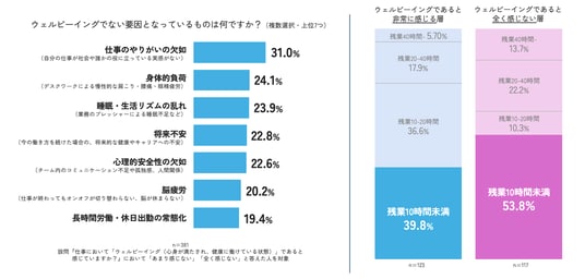 仕事において「ウェルビーイングであると感じない」層に、その要因について質問したところ「仕事のやりがいの欠如(自分の仕事が社会や誰かの役に立っている実感がない)」が31.0%と最も高く、「長時間労働・休日出勤の常態化」は19.4%と2割を下回る結果になりました。さらに、残業時間について見ると、「残業10時間未満」と回答した割合は、「ウェルビーイングであると非常に感じる層(39.8%)」よりも「全く感じない層(53.8%)」のほうが多い結果となりました。