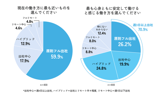 現在の働き方について聞いたところ、全体の59.9%が「フル出社」をしている結果となり、リモート勤務ではなく出社を原則とする企業が過半数であることがわかりました。さらに、「あなたが最も心身ともに安定して働けると感じる働き方」について質問を行ったところ、「週の半分以上はオフィスに出社したい」と考える人が全体の7割以上にのぼり、従業員側の意識においても出社回帰の傾向にあることが明らかになりました。