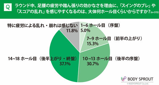 スコアが乱れるタイミングとして、**10~13ホール(30.7%)・14~18ホール(37.1%)**と、約7割が後半ホールを挙げました。これは単純な疲労だけが要因ではなく、ラウンドを通じた姿勢のズレの"蓄積"が、後半に一気に表出していると考えられます。