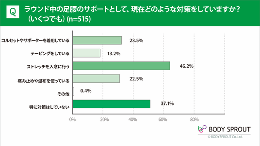 現在の対策として「ストレッチ(46.2%)」や「サポーター着用(23.5%)」が上位に挙がる一方、37.1%が「特に対策していない」と回答しました。