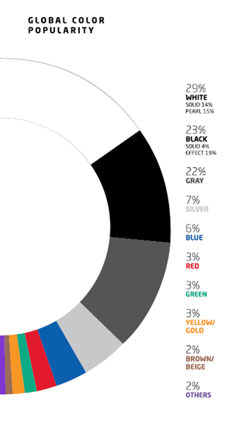 アクサルタのモビリティコーティング部門技術担当副社長であるレイ・チャオ博士は、次のように話しています。「今年の報告書では、無彩色が世界の車体色を支えるという状況が続いていると同時に、