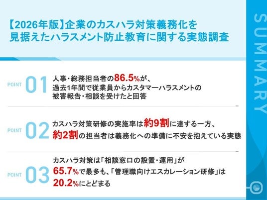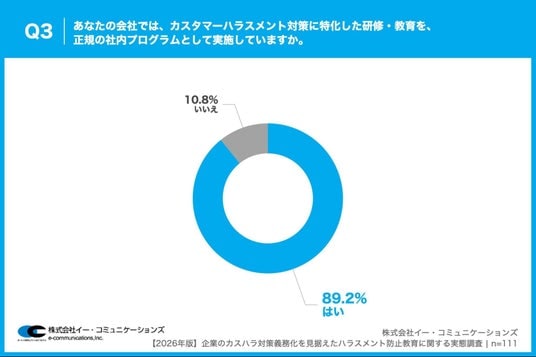 株式会社イー・コミュニケーションズ(本社:東京都港区、代表取締役:佐藤信也)は、従業員数100名以上の企業で、ハラスメント対策や社員教育・研修の企画・運営に携わっている人事・総務担当者111名を対象に、【2026年版】企業のカスハラ対策義務化を見据えたハラスメント防止教育に関する実態調査を実施しましたので、お知らせいたします。