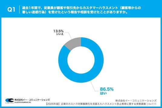 「Q1. 過去1年間で、従業員が顧客や取引先からカスタマーハラスメント(顧客等からの著しい迷惑行為)を受けたという報告や相談を受けたことがありますか。」(n=111)と質問したところ、「はい」が86.5%、「いいえ」が13.5%という回答となりました。