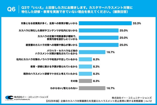 「Q6. Q3で「いいえ」と回答した方にお聞きします。カスタマーハラスメント対策に特化した研修・教育を実施できていない理由を教えてください。(複数回答)」(n=12)と質問したところ、「対象となる従業員が多く、全員への教育が難しいから」が33.3%という回答となりました。