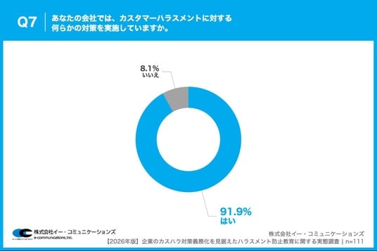 「Q7. あなたの会社では、カスタマーハラスメントに対する何らかの対策を実施していますか。」(n=111)と質問したところ、「はい」が91.9%、「いいえ」が8.1%という回答となりました。