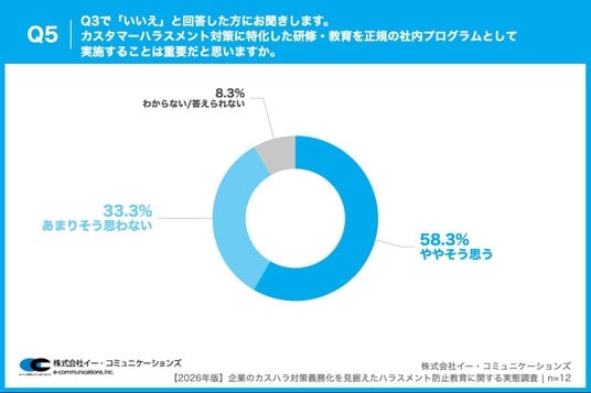 「Q5. Q3で「いいえ」と回答した方にお聞きします。カスタマーハラスメント対策に特化した研修・教育を正規の社内プログラムとして実施することは重要だと思いますか。」(n=12)と質問したところ、「非常にそう思う」が0.0%、「ややそう思う」が58.3%という回答となりました。
