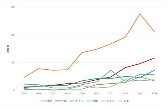 2022年以降は中国が二番手につけ、日本・英国・ドイツ・カナダに対し、一歩抜きんでている状況です。