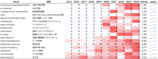 「synthesis-characterization」や「design-build-test-learn」など、実験操作だけでなく、実験結果の評価と分析までをセットで実行するシステムが想定されるキーワードが成長率上位に見られます。実験できまっておこなう操作をくりかえす段階から、考察と今後の展開構築も自動で実施するシステムの開発がはじまっているようです。