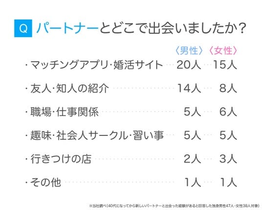 40代になってから新しいパートナーと出会った経験がある85人に「パートナーとどこで出会いましたか?」と尋ねたところ、最多は「マッチングアプリ・婚活サイト」35人(41.18%)でした。