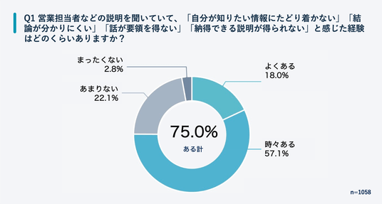 「知りたい情報にたどり着かない」「結論が分かりにくい」など、説明を聞くことに疲れや負荷を感じる経験について尋ねたところ、75.0%が「よくある」「時々ある」と回答しました。