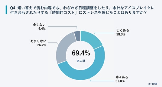 結論にたどり着くまでに時間がかかる、日程調整や前置きが長いなど、本題以外の時間コストが大きい状態です。実際に、日程調整やアイスブレイクなどの時間コストにストレスを感じる人は69.3%でした。