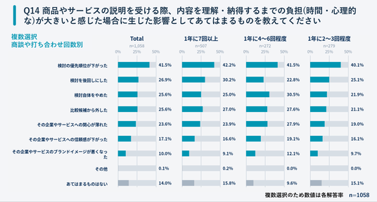 属性別に見ると、20~40代では説明疲れが7割後半と高く、50代より高い傾向が見られた半面、役員・管理職層では、要点にたどり着くまで時間がかかる説明に対して、前向きに検討しにくい傾向が強く見られました。さらに、営業説明や商談への接触頻度が高い層ほど、比較候補からの除外や検討優先順位の低下が起きやすい傾向も確認されました。