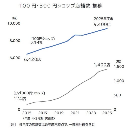 店舗網では、大手4社の店舗数は2026年3月末時点で9400店規模が見込まれ、前年度から200店以上、10年前から1.4倍・約3000店増加した。郊外のロードサイド店舗やショッピングモール内の大型店から、近年は食品スーパー内など延床面積の小さい極小店舗まで幅広い店舗ラインナップで、全体で年間100店を超える出店ペースが続いている。他方で、中小・地場の100円ショップでは原材料価格の高騰などから単独で「100円」の販売価格を死守するのが困難で、既存店舗の維持ができずに店舗網の縮小や撤退も散見されるなど、大手と中小で二極化傾向がみられる。