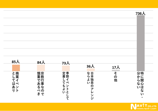 「イースターが日本で広まることについてどう思いますか?」という質問を複数選択可で行ったところ、「特に関心はない・分からない」が最も多く736人、「商業イベントとしてはあり」が85人、「宗教行事なので慎重であるべき」が84人と続きました。