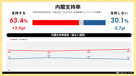 高市内閣の支持率は63.4%(前週比+2.9pt)となりました。