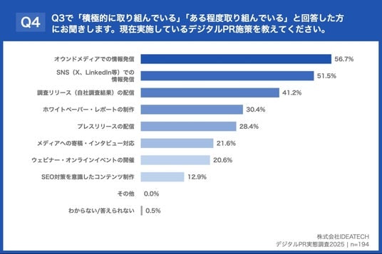 A.生成AIが回答を生成する際、RAG(検索拡張生成)という仕組みで一次情報を優先して引用します。調査概要(対象者・時期・手法)が明示されたプレスリリースは一次情報として高い評価を受けます。IDEATECHの「デジタルPR活用実態調査2025」(218名対象)では、デジタルPR施策として調査リリースを実施している企業が41.2%に達しており、AI時代の情報発信手段として普及しています。