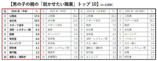 子どもの将来の安定を願う気持ちは毎年変わらず、今年も「公務員」が1位となりました。「会社員」は昨年よりポイントを落としたものの2位に定着。子どもの人気に連動して、「消防・レスキュー隊」は過去最高タイの4位となりました。一方、「医師」は5位、割合も5.9%と過去最少になりました。