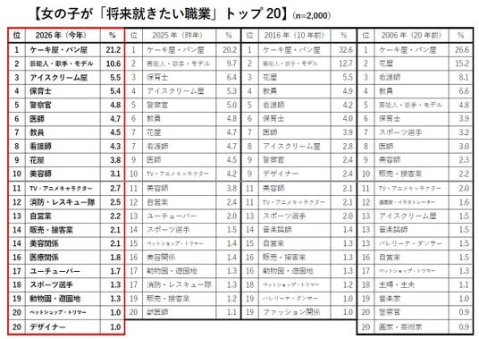 20年前と比較すると、「漫画家・イラストレーター」「音楽講師」「バレリーナ・ダンサー」「音楽家」「画家・芸術家」といった芸術系の職業の多くが20位圏外となりました。一方で、「アイスクリーム屋」「ユーチューバー」「動物園・遊園地」などのカワイイ仕事、「消防・レスキュー隊」「医療関係」といったエッセンシャルワークに憧れを抱く女の子が増えているようです。