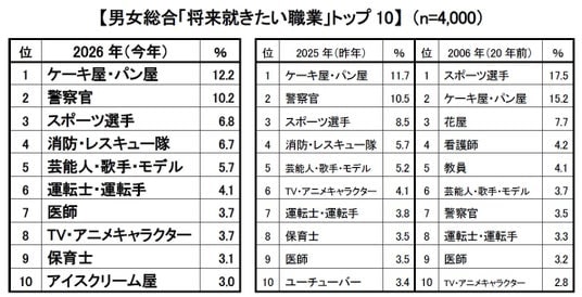 20年前との比較では、当時多くの男の子の憧れだった「スポーツ選手」が10.7ポイント減らして1位から3位に。男女両方で人気が高まっている「警察官」が6.7ポイント増やして7位から2位に上がりました。11位だった「消防・レスキュー隊」も3.9ポイント増やして4位に入り、人を助ける仕事への関心が高まっていることがうかがえました。
