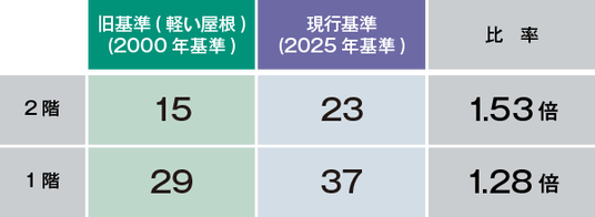 品確法仕様規定で旧基準(2000年基準)と現行基準(2025年基準)を比較すると、耐震等級1では、30.5÷27.2=1.12倍、耐震等級2では、38.5÷34=1.13、耐震等級3では、46÷41.1=1.12と、平均で1.12倍となりました。